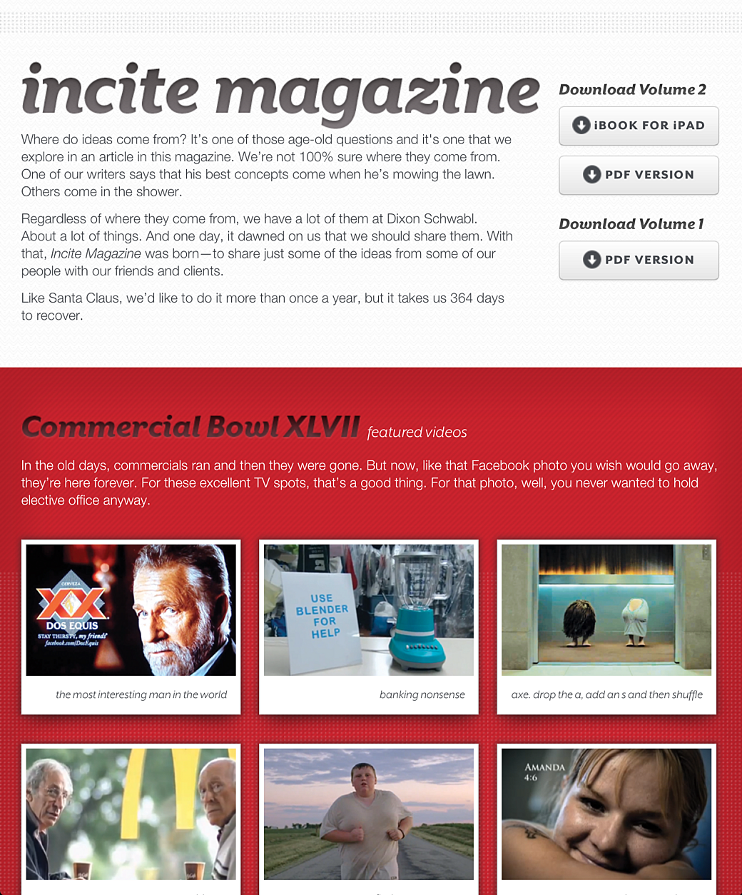 The project was part of a self-promotion paper magazine that Dixon Schwabl released from time to time. The magazine was a showpiece for our services and it highlighted some of our clients and success stories. Employees could volunteer to write an article and our Creative Team would work magic coming up with some amazing layouts and slick illustrations. From time to time we would get a local photographer on board to shoot photos for it and we would use our in-house video production studio to shoot videos that could be linked to with a QR code or a vanity URL.