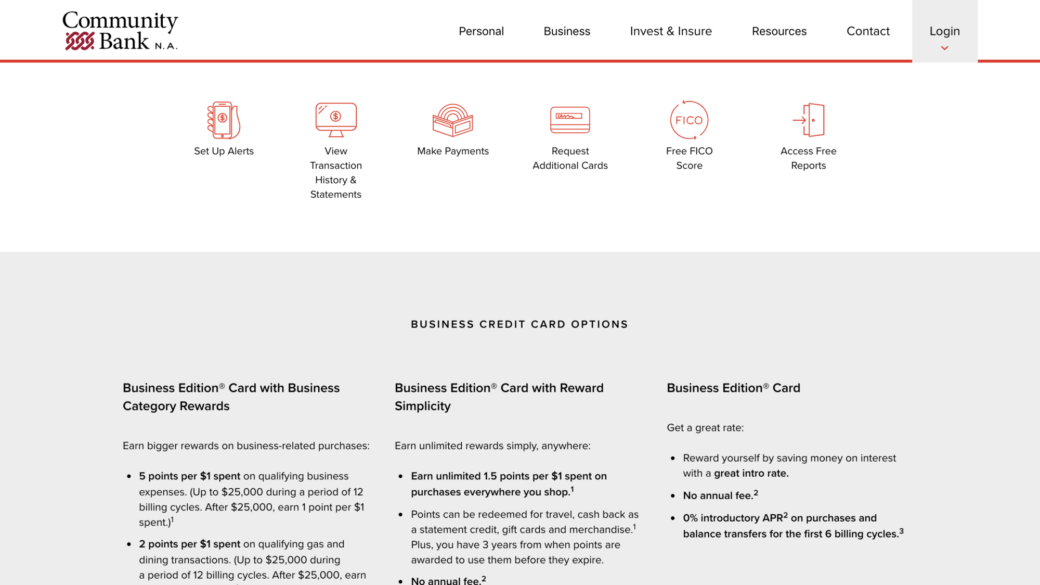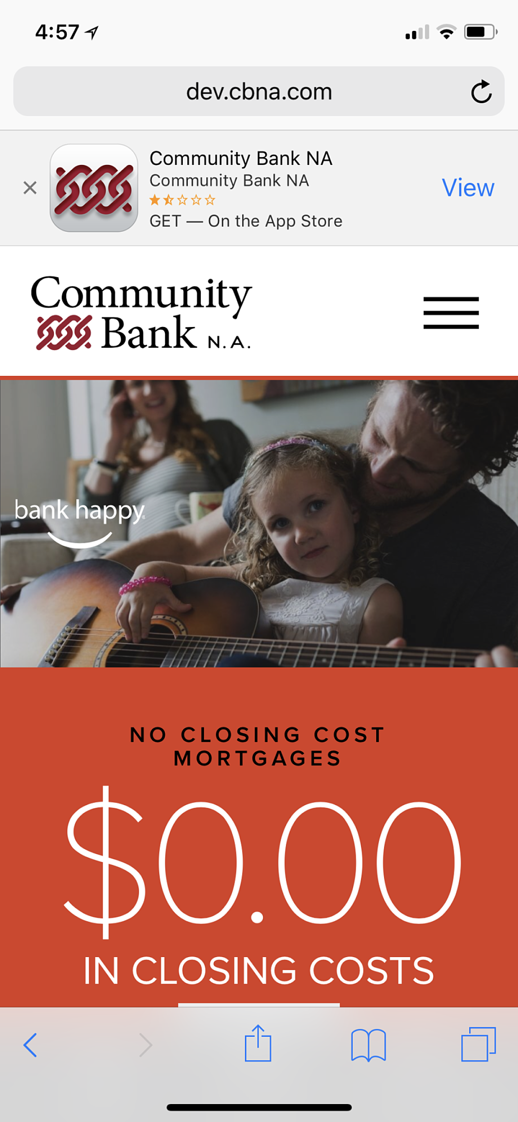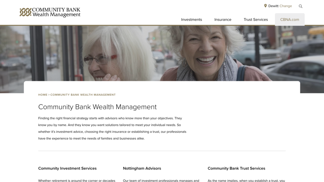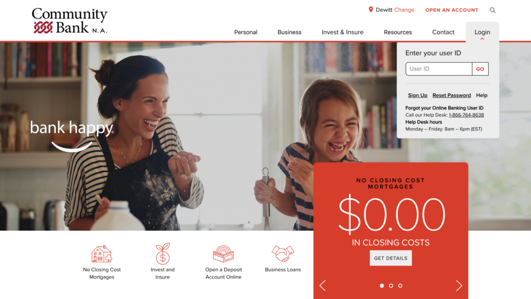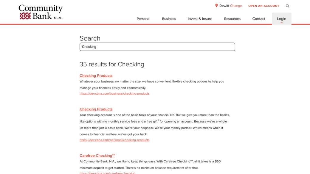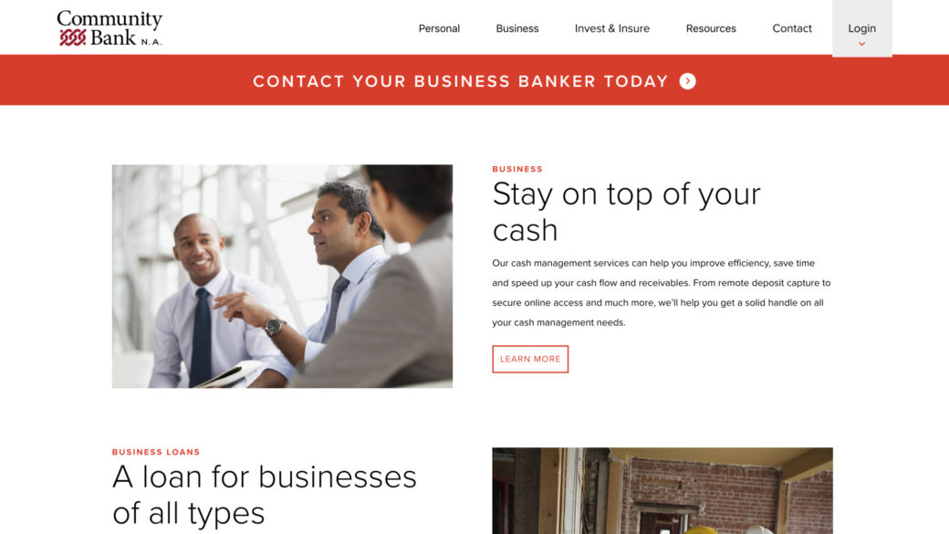 In 2018, we launched a website for Community Bank, N.A. (CBNA). The site was the marketing and informational side for the US regional bank. It featured information around different account types, included rates and offers, had a store finder, and had a landing page builder used in marketing campaigns.