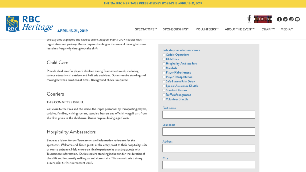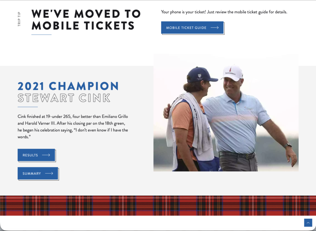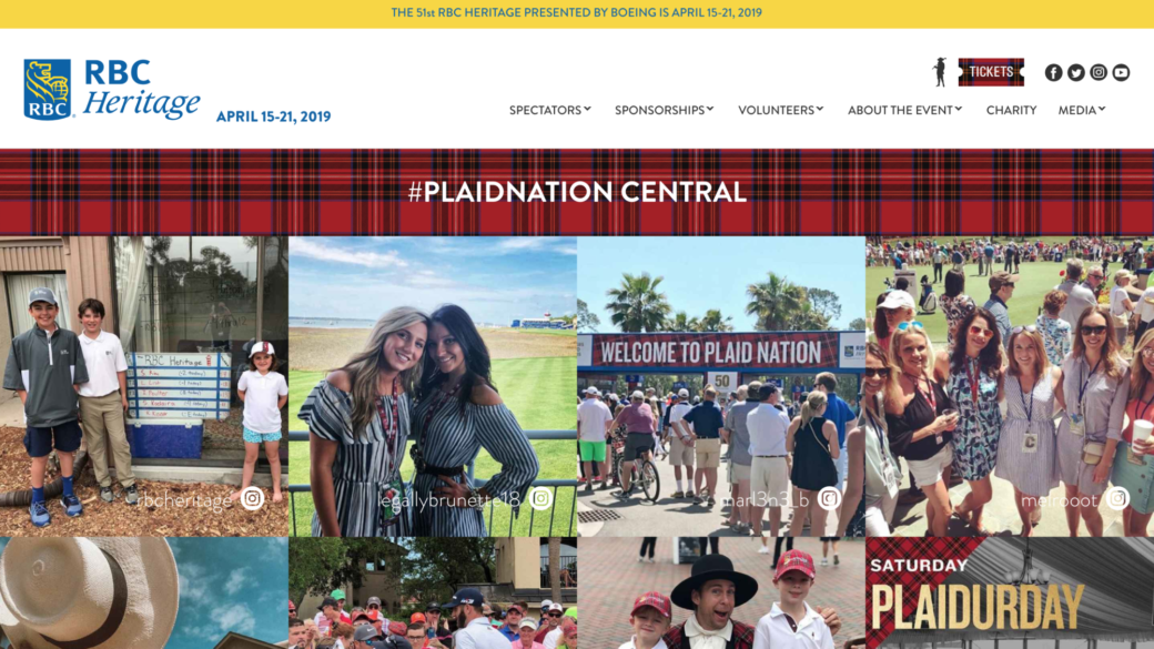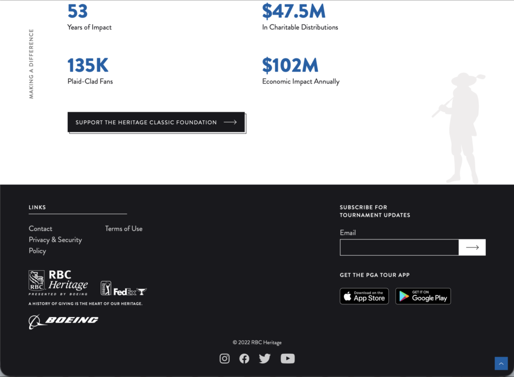 The look and feel of the site was meant to invoke the landmarks of the golf course in Hilton Head where the event was played. From the iconic lighthouse to the event’s tartan plaid texture, we combined event specific imagery around a brand that fit the RBC sponsor.