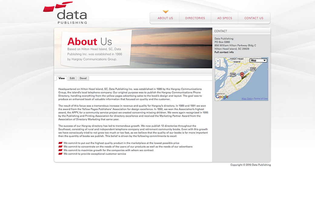 I was involved in developing the website along with our co-op-turned-employee, Zach Horton. Most of the site was built with HTML, CSS, and PHP, but we eventually added Drupal to help manage users, photo uploading, and publishing blog posts and photos to the gallery.