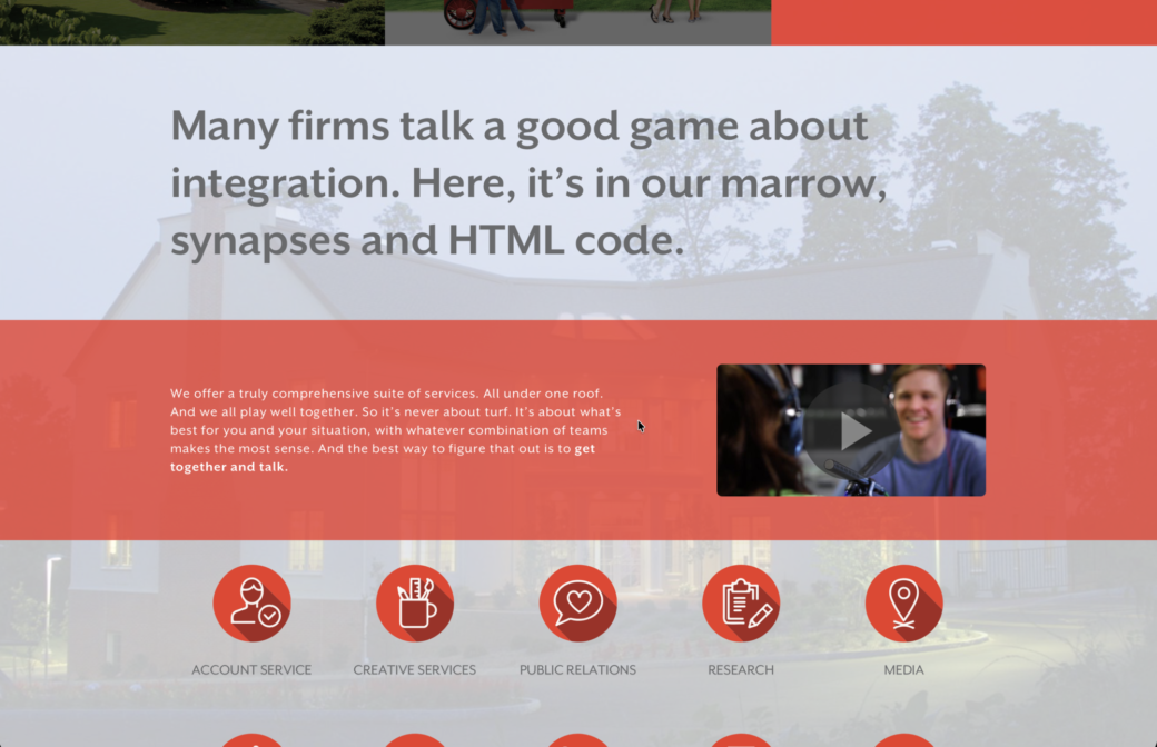 The design of the 2014 site was very ambitious. It would be responsive, include videos and transparent overlays with large, bold color changes. It had a section on the homepage that when clicked, the entire homepage would shift over to the left and a directory of each employee with custom photography slid in.
