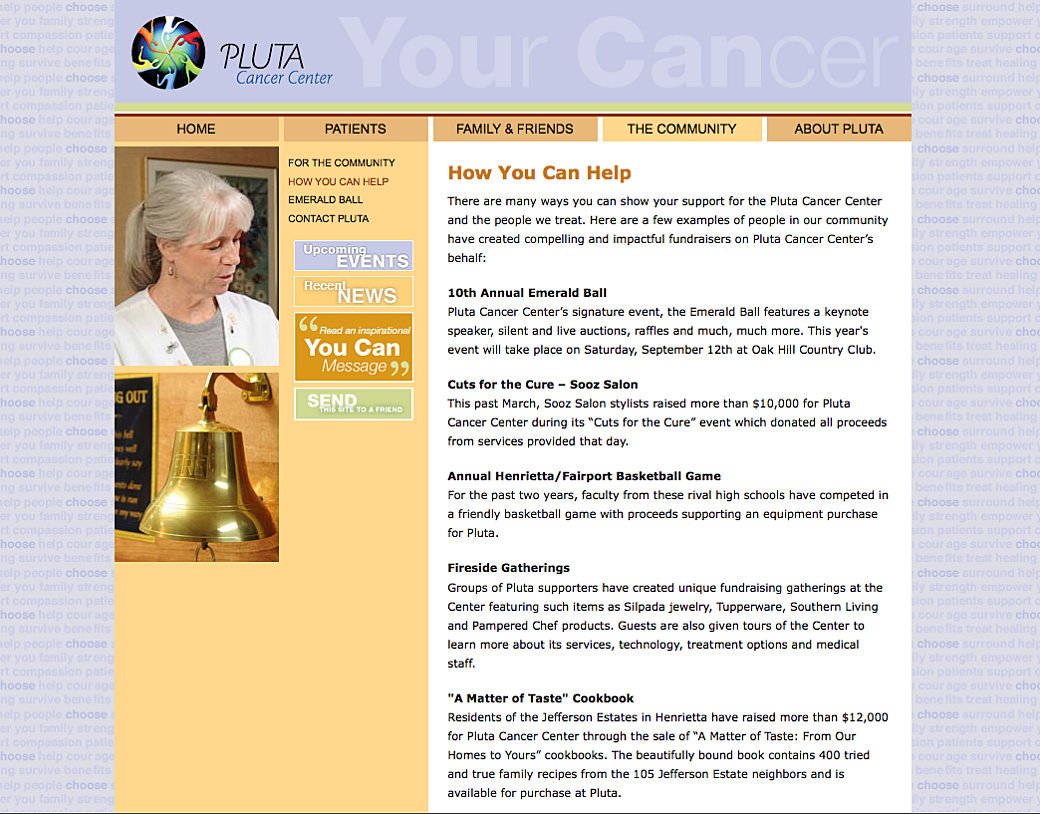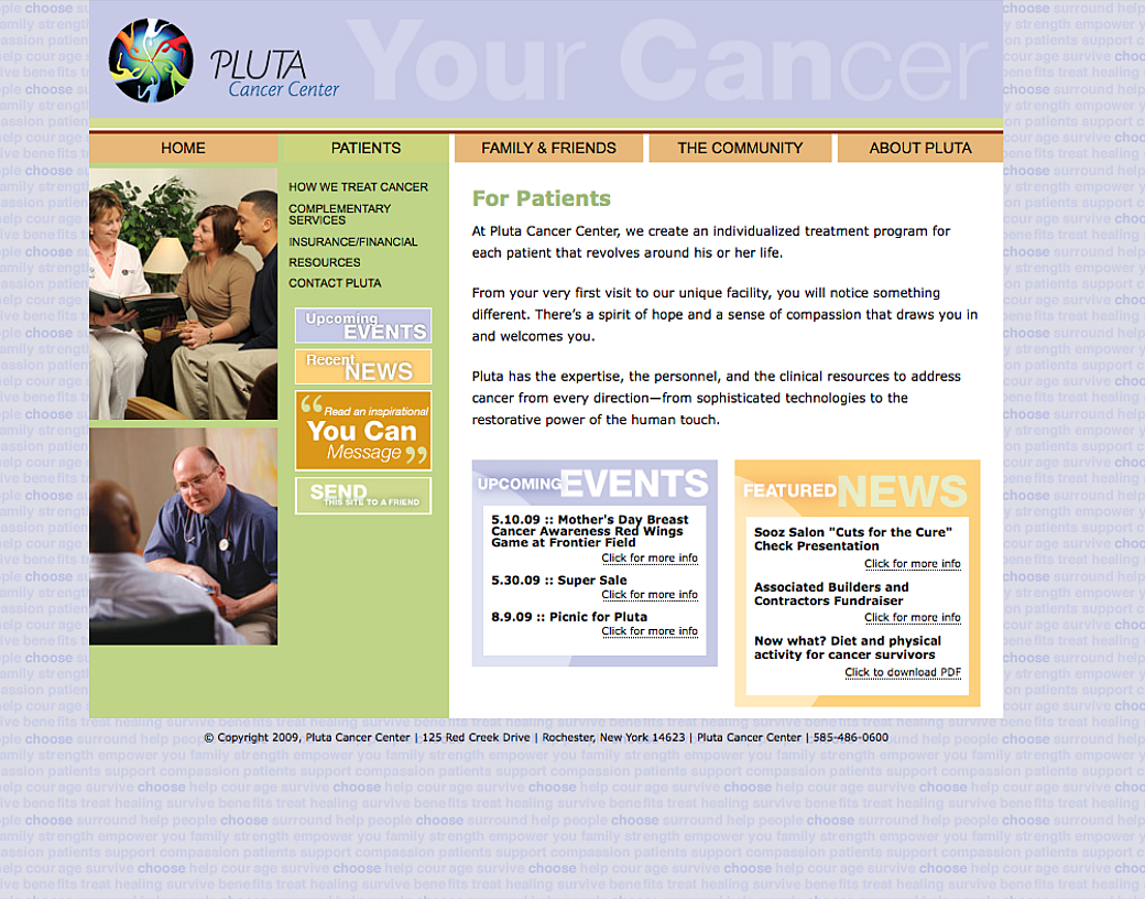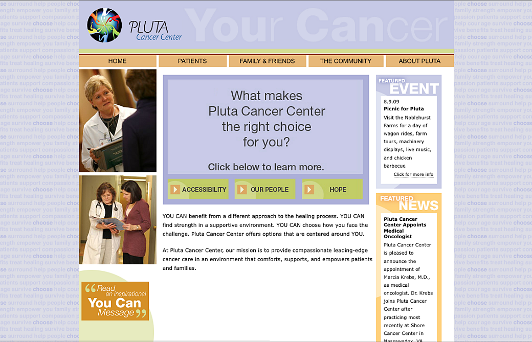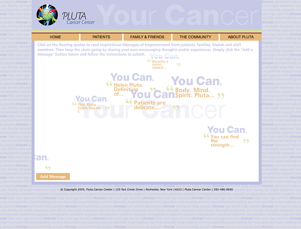 The Pluta Cancer Center website is a resource for patients and family members to get information on where and how their treatment programs took place. This project was one we launched in early 2009 and it featured one page where users could inspire others or be shown messages of support in an interactive way.