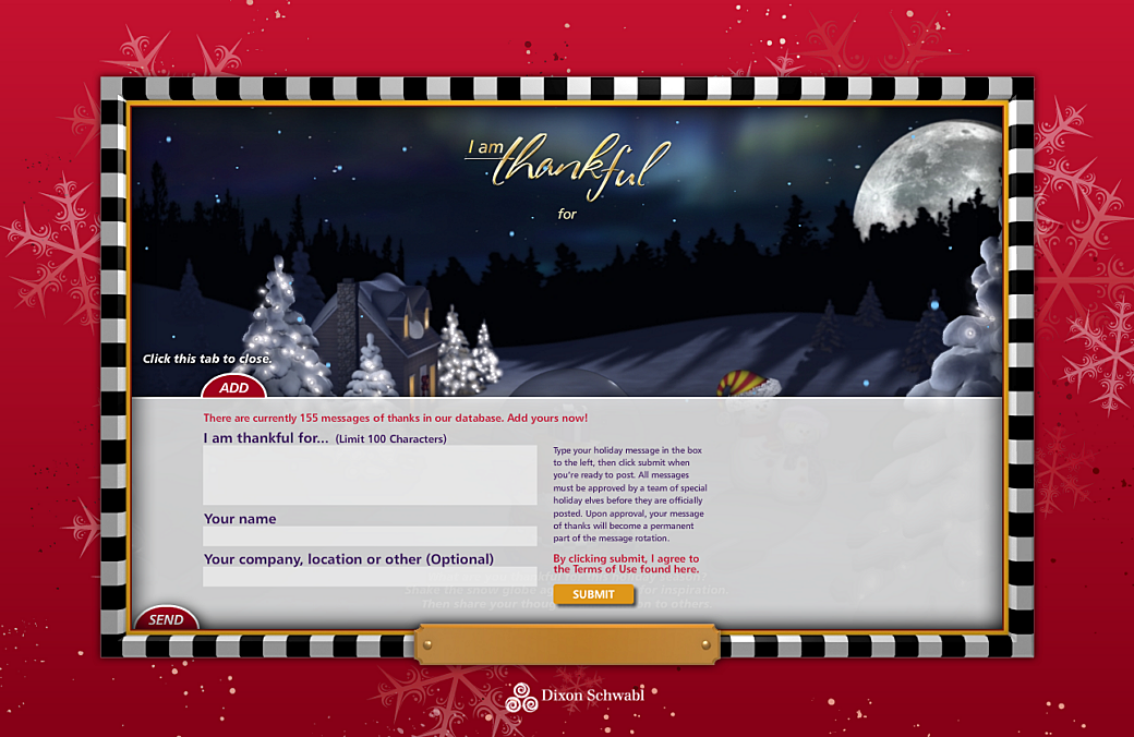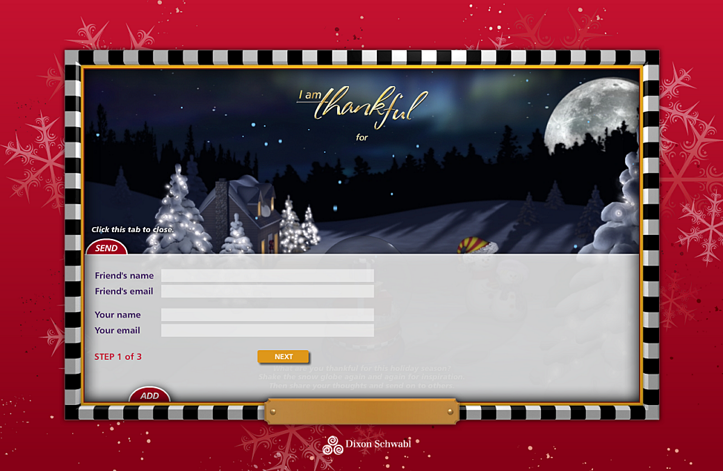 At the tail end of 2008, me and the other folks at Dixon Schwabl created a holiday themed website that was part self-promotion and part community involvement. For this project we collected a handful of messages from friends and family and we displayed them one at a time on an interactive Flash website. The website featured a snow globe and every time you "shook" the snow globe a new message would appear.