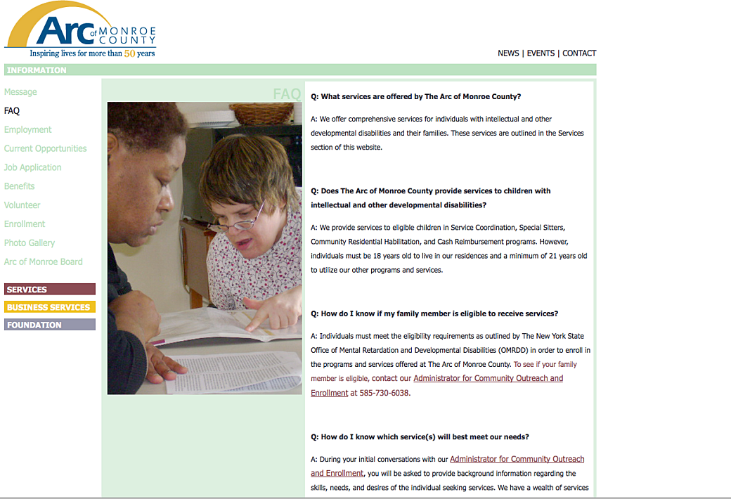 The ARC of Monroe County was a special site for us at DS. We loved promoting organizations who took care of our neighbors and their family members. For their main website we broke it up into four main sections, and for each section there was a title page that had links to all of the section’s pages on the left. On the right was a looping video that featured members of the ARC community holding signs with letters on them that spelled out the section name.