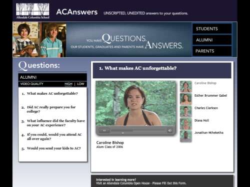 My first project for the ad agency, Dixon Schwabl Advertising, was a Flash-based microsite for a private K-12 school, Allendale Columbia. We called it ACAnswers and it featured a series of questions that were answered in the form of video testimonials by current students, alumni, and parents of students. The idea behind the site was to reach each of these segments and help relate the benefits of the school in a way where the audience can connect with the folks who have experience with the school.